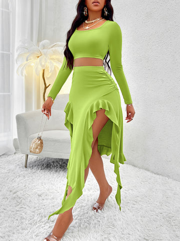 Elevate your feminine charm with this Women's Solid Color Round Neck Long Sleeve Top Ruffled Skirt Suit. Crafted from 100% Polyester, this suit features a stylish ruffled skirt and a classic round neck top. Perfect for any occasion, this suit exudes elegance and sophistication, making it a must-have in your wardrobe.