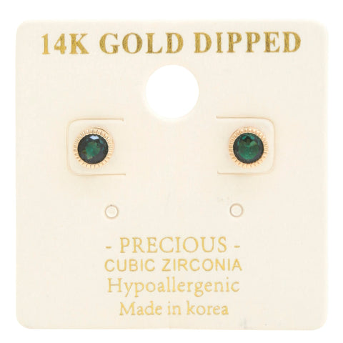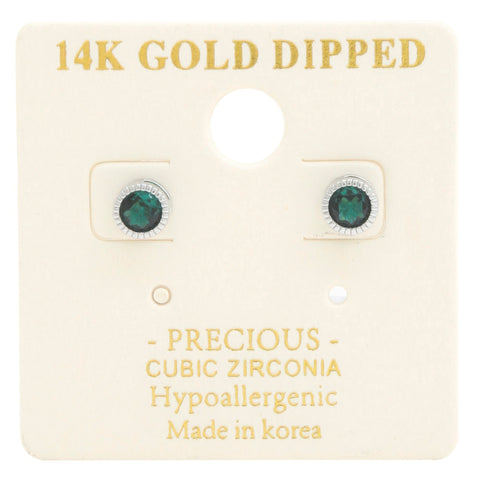 Key Features: - Material: 14K gold dipped with a rhodium or silver finish, offering a luxurious look and enhanced durability. - Stones: High-quality cubic zirconia (CZ) stones for a brilliant and eye-catching sparkle. - Color Options: - Silver/Green - Silver/Rhodium - Gold/Rhodium - Gold/Green - Design: Classic round stud design that highlights the brilliance of the CZ stones. The gold-dipped or rhodium setting adds a sophisticated touch. - Versatile Styling: Perfect for everyday wear or special occasions, these earrings add a touch of elegance to any outfit.
