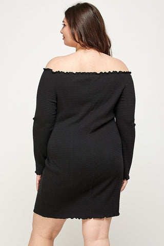 Imported 1XL.2XL.3XL Plus size, solid smocked off shoulder dress, with long sleeves, ruffled hem, and fitted silhouette 61% Polyester 31% Cotton 4% latex 4% Spandex Black HAU